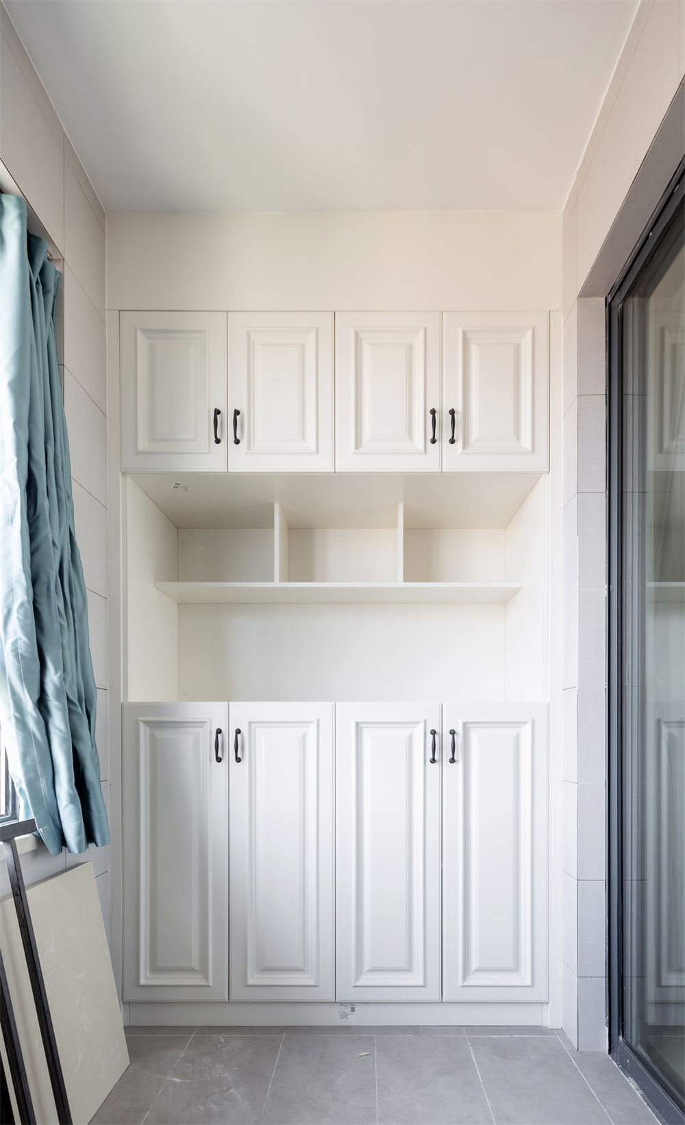 朝南的阳台可以在太阳升起时,感受来自清晨的第一缕阳光,芬兰白整面到顶阳台柜的设计,可以放置衣架以及冬天的鞋子。中间镂空部分加做了三个空格,给收纳增加了额外的空间。