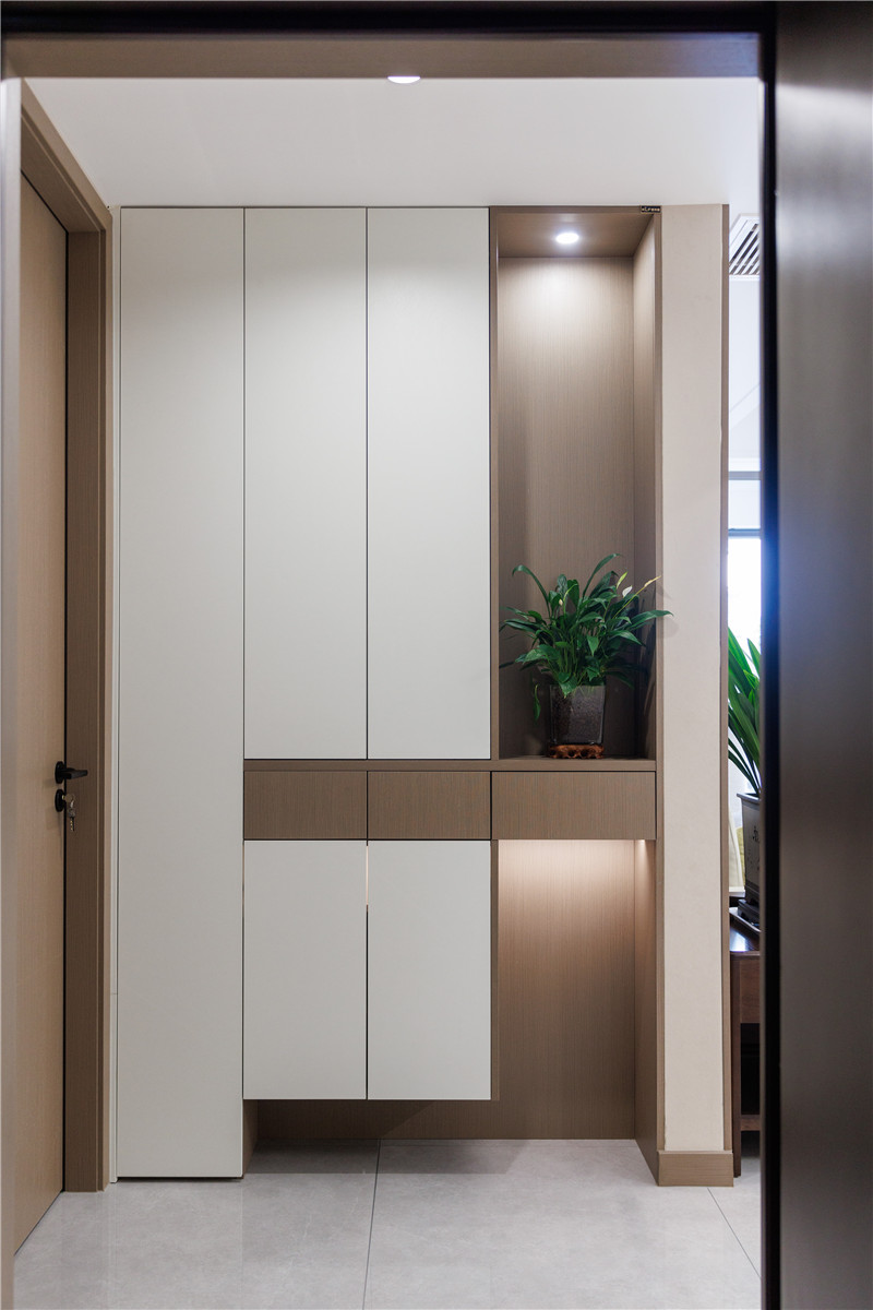 根据生活习惯,玄关柜在底部留空一双鞋再加3-5cm的高度,方便日常放鞋、换鞋;保留50-60cm空间置放雨伞一些长柄物件,上分留空放置钥匙、大衣等。