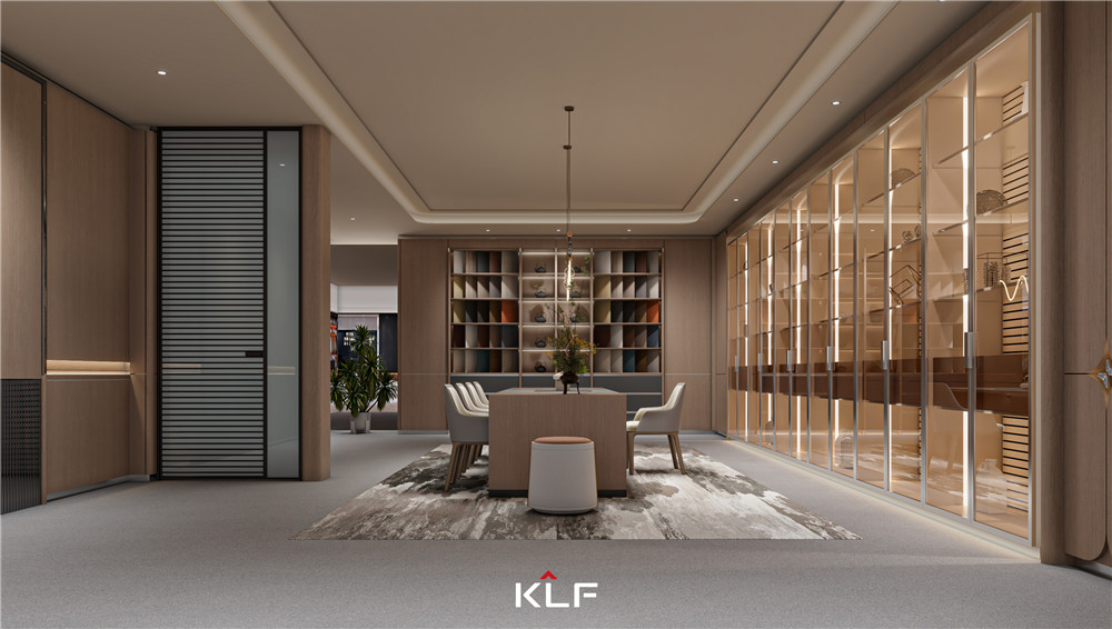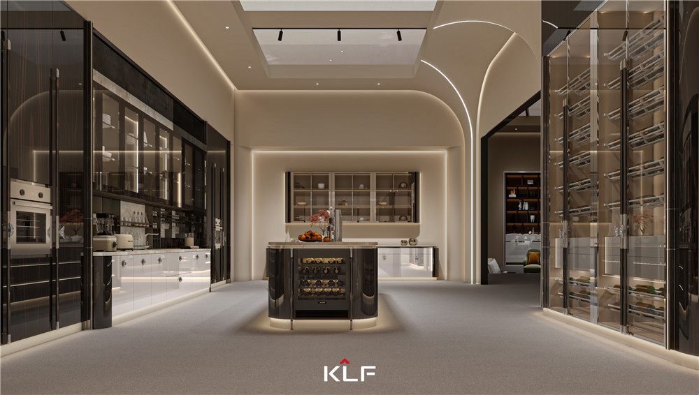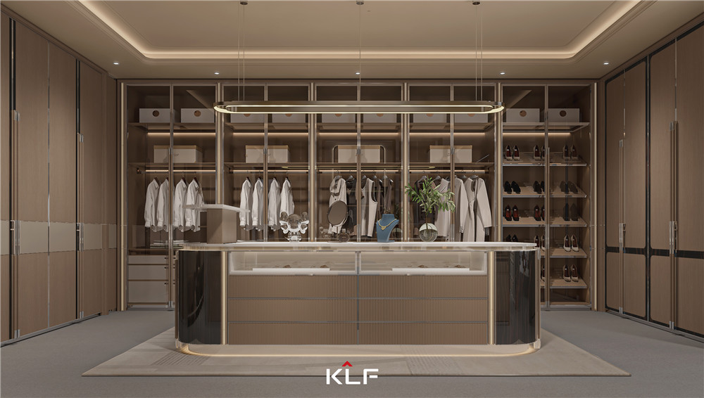 颜色上以白橡小山木纹搭配玻璃来呈现出轻奢,氛围灯光渲染出柔晕光线,增加层次感;独特的“F”品牌标签拉手,寓意“福”;挂衣杆以KLF中的“K”为灵感,打造了一个具有品牌辨识度的蝴蝶挂衣杆。
