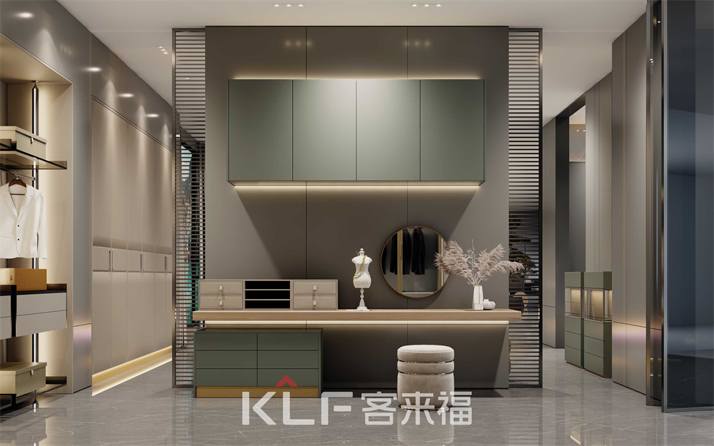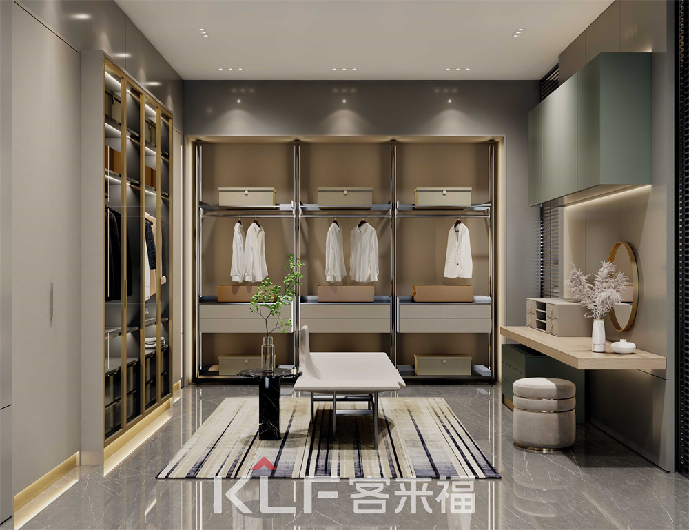 衣帽间里藏了生活的仪式感!墨奈系列衣帽间中间采用全透明的天地铰链门,精美的展现出内里衣物,同时还能防尘。侧边柔杏色梳妆台搭配观看死角的氛围条带灯,让衣帽间整体梳妆一体,打造出优雅环境。