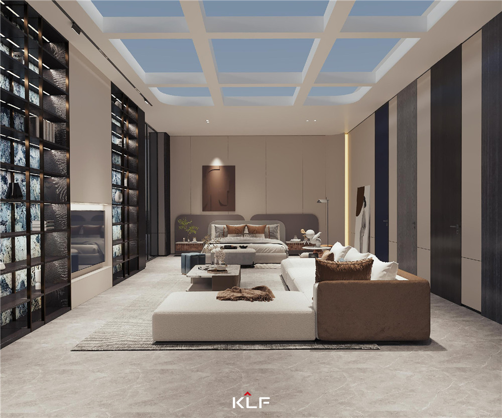 衣帽间采用时尚科技的电动平移巴士门,于细节之处彰显魅力;将衣柜分为叠放区、悬挂区和抽拉区,分功能存储提高生活便捷度;衣帽间岛台中间可设计升降饰物架,存储高价值的饰品。