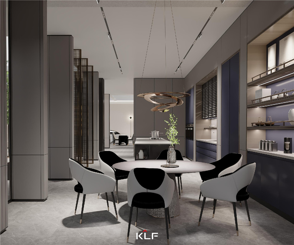中西厨一体化设计,有效解决顽固油烟侵扰的问题;墙体采用墙板整包,将烘烤机、冰箱、咖啡机等家电嵌入其中,不占空间的同时优化家庭动线;橱柜采用岩板,使其表面耐污耐划且抗指纹。